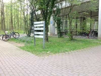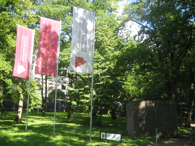 Finally you'll reach the main entrance of the university. Cross Moltkestraße, go past the flags, and follow the SotM-EU signs.